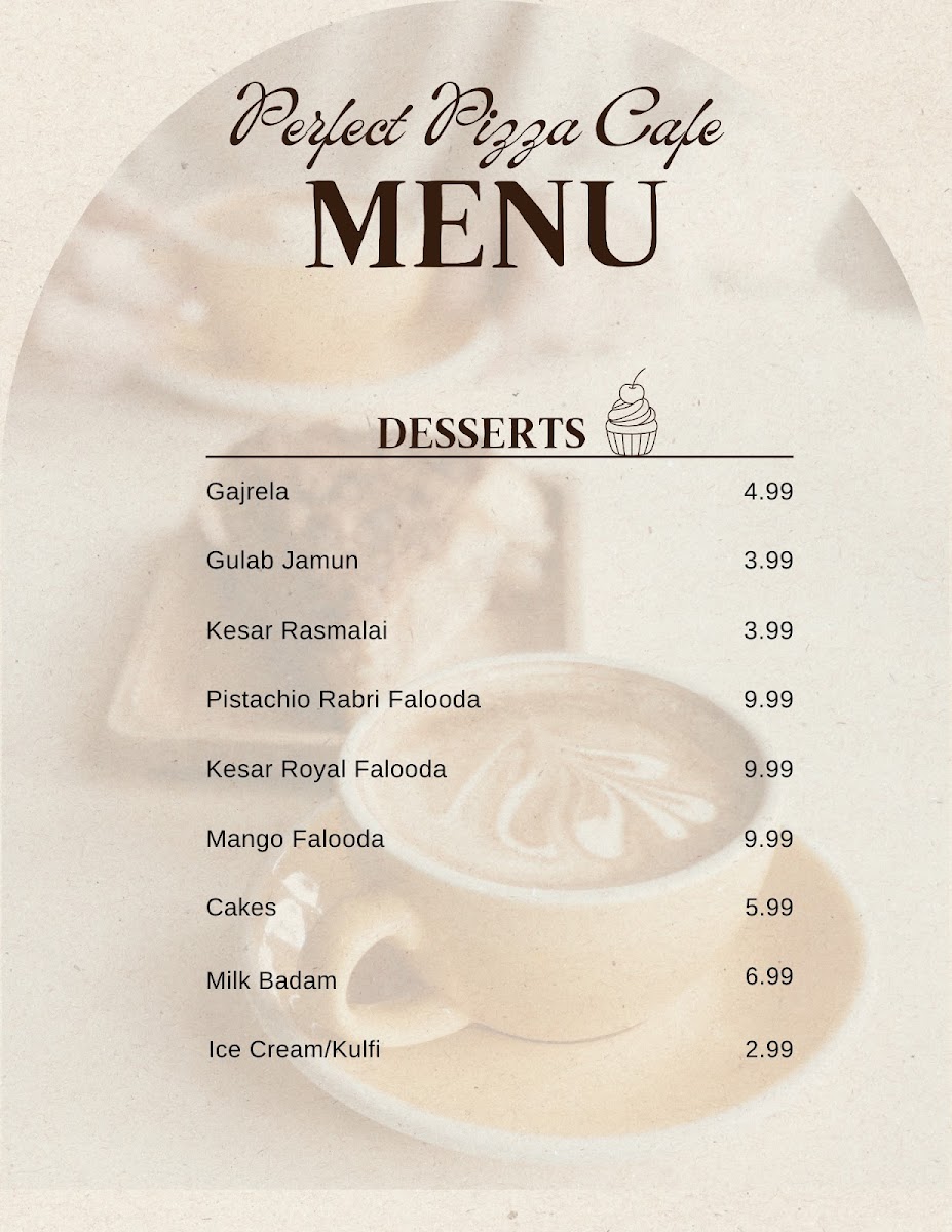 But it’s not just about pizza here. Perfect Pizza also excels in their Faloooda desserts, offering unique sweet options like the Pistachio Rabri Faloooda and Mango Faloooda. These decadent treats, combining ice cream and traditional vermicelli, are the perfect way to round off your meal and satisfy your sweet tooth in style.